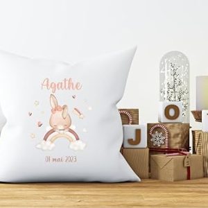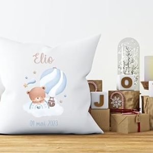 Coussin naissance personnalisé ourson mongolfiere garcon
