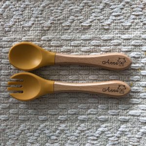 Set de Couverts Bébé Personnalisé – Cuillère et Fourchette Manche Bois et Silicone, Cadeau naissance petit budget, Cadeau Unique pour Bébé