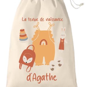 Pochon en Coton Personnalisé – « La Tenue de Naissance de (Prénom) » | Sac Rangement Bébé | Valise Maternité | Cadeau Naissance