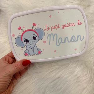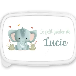 Boîte à goûter personnalisée – Motif Éléphant Bleu – Fond bleu – Rentrée scolaire – Prénom personnalisable