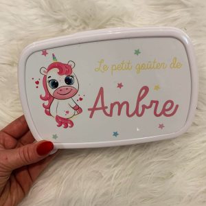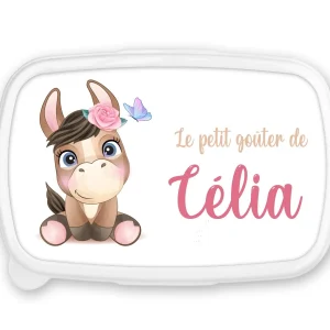 Boîte à goûter personnalisée prénom ânesse fleurie – Fond rose – Lunch box fille – Rentrée scolaire maternelle ou crèche