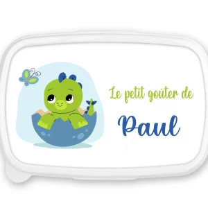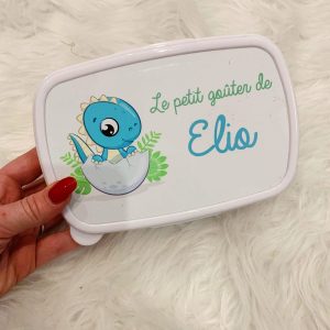 Boîte à goûter personnalisée – Motif Dinosaure – Fond bleu – Rentrée scolaire – Prénom personnalisable