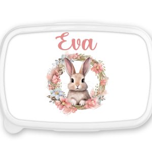 Boîte à Goûter Personnalisée – Lapin avec Prénom – Fond Bleu ou Rose – Cadeau Mignon et Pratique pour Pâques