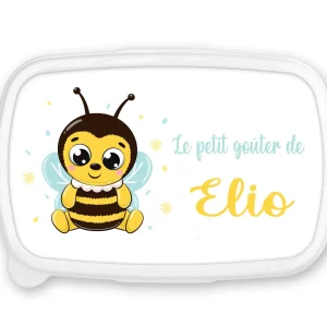Boîte à goûter personnalisée – Motif Abeille – Fond bleu – Rentrée scolaire – Prénom personnalisable