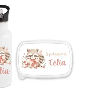 Gourde + boîte à goûter personnalisées – Raton laveur automne – Prénom au choix – Ensemble enfant école – Bébé Panda