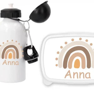 Set boîte à goûter + gourde personnalisée 500 ml – Arc-en-ciel rose – Prénom enfant