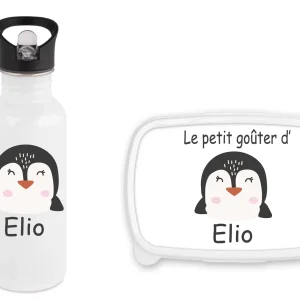 Set personnalisé enfant – Gourde 600 ml bouchon paille + boîte à goûter – Motif pingouin et prénom