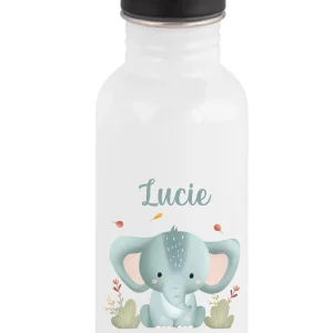 Gourde paille 600 ml personnalisée motif éléphant bleu – Prénom enfant – Parfaite rentrée scolaire