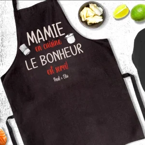 Tablier de Cuisine Personnalisé – « La Bonne Cuisine de Mamie » – Cadeau Grand-Mère – Tablier Noir avec Motif Floral & Prénom