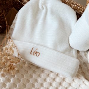 Bonnet de Naissance en Maille Velours Côtelé Écru – Prénom