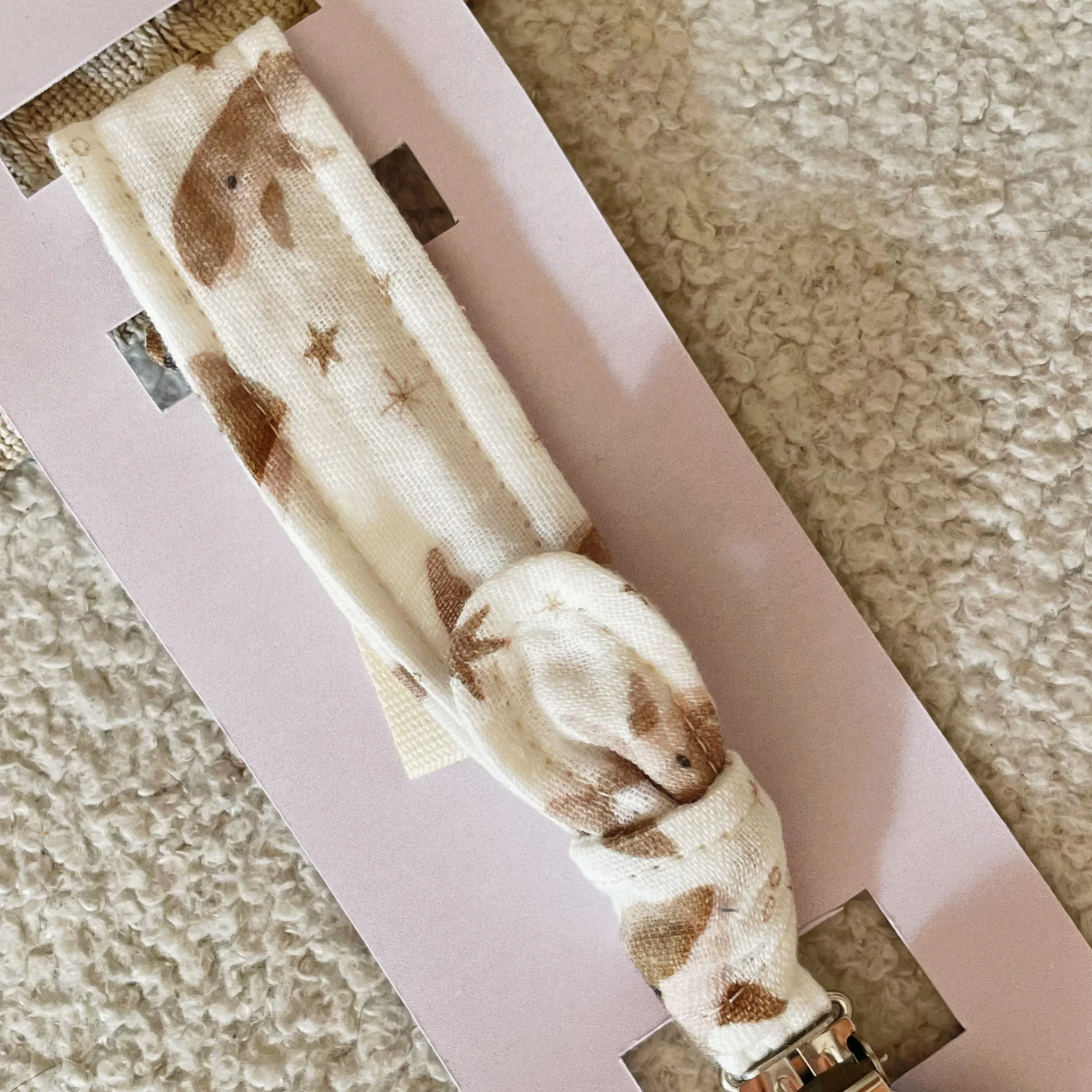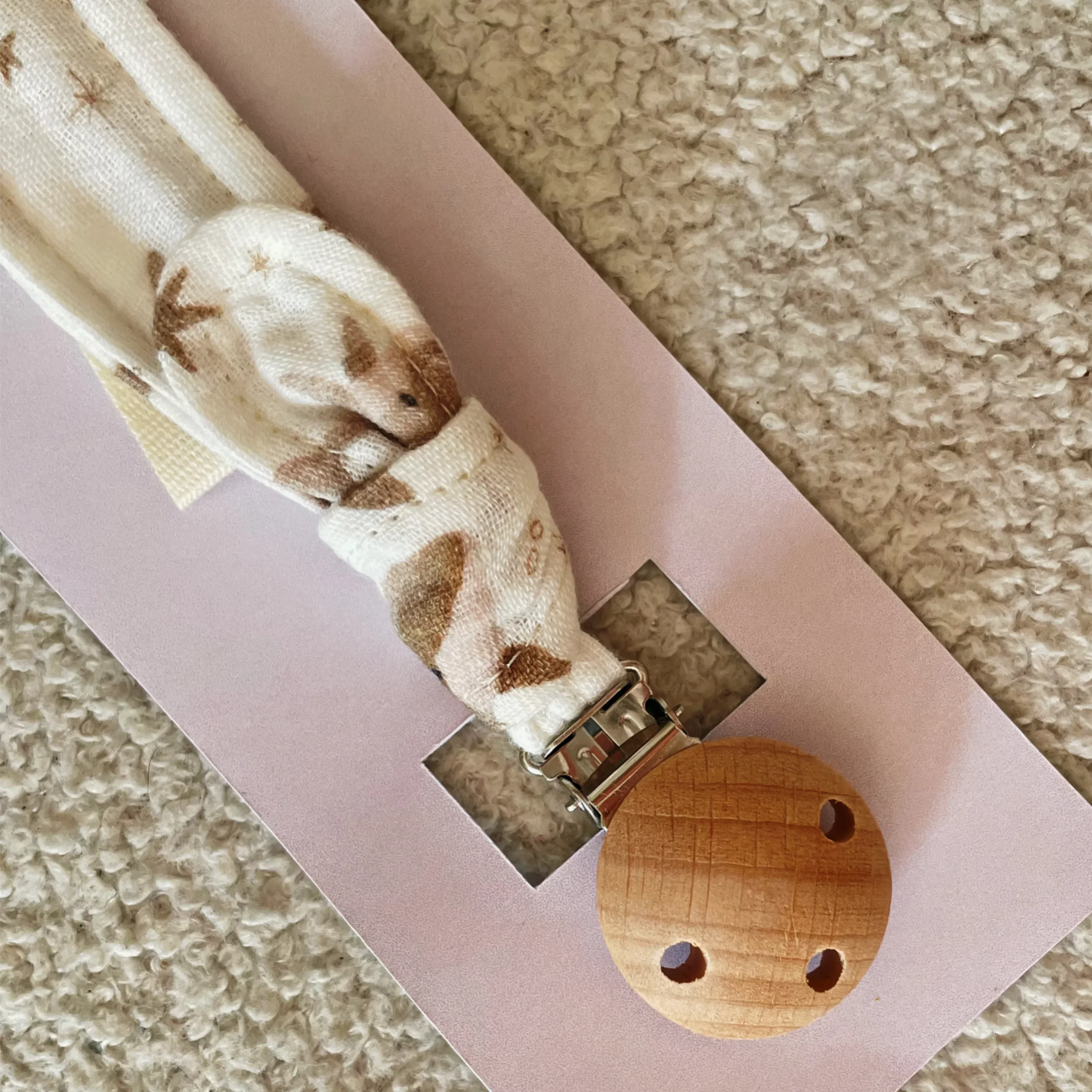 - Matériau : Tissu double gaze 100% coton – Cordon en sergé de coton – Clip en bois sans BPA ni BPS