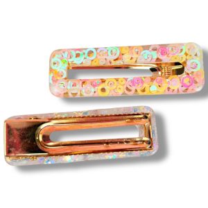 Une jolie barrette colorée et unique avec un traitement UV incrustée de jolies paillettes colorées à formes.