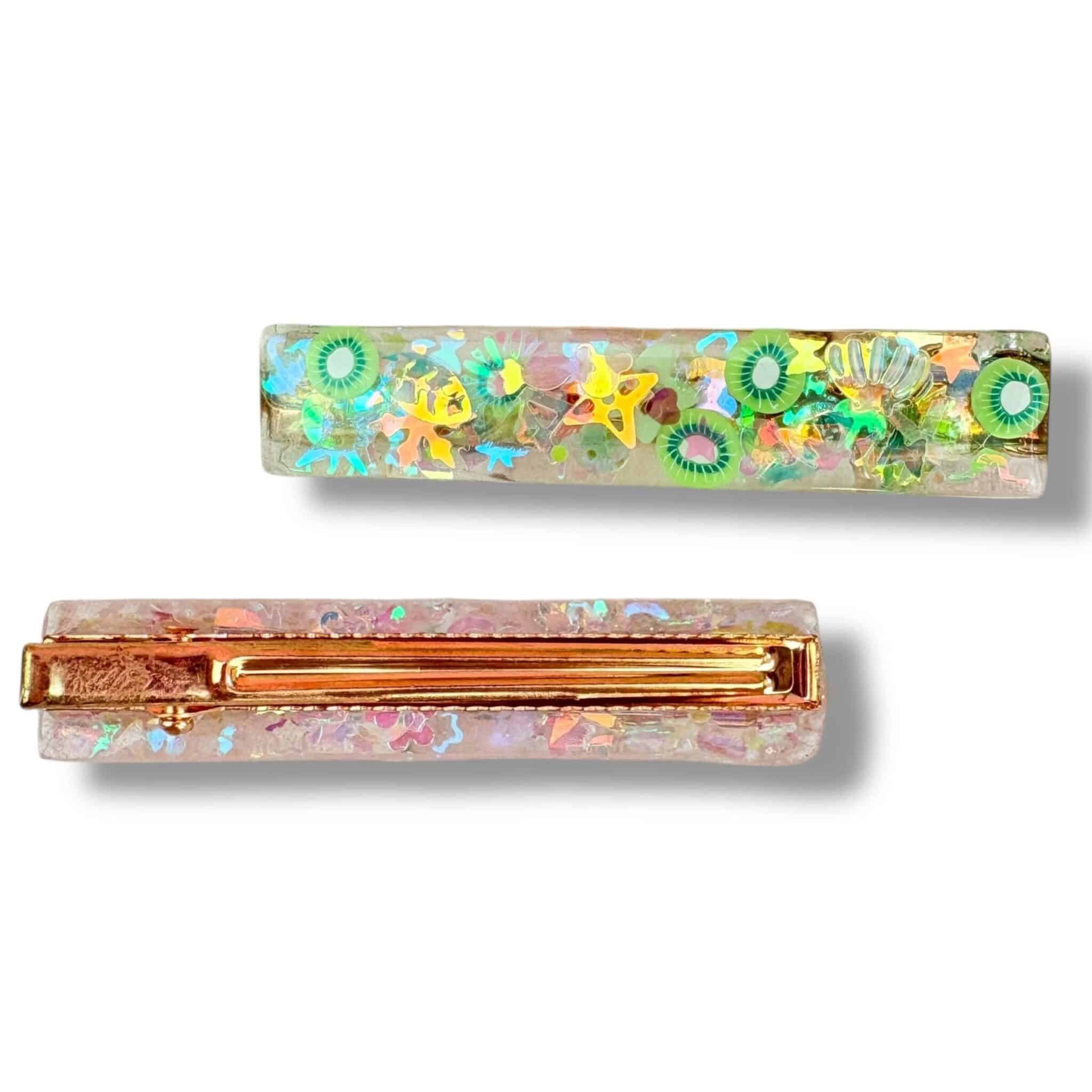 Une jolie barrette colorée et unique avec un traitement UV incrustée de jolies paillettes colorées à formes.