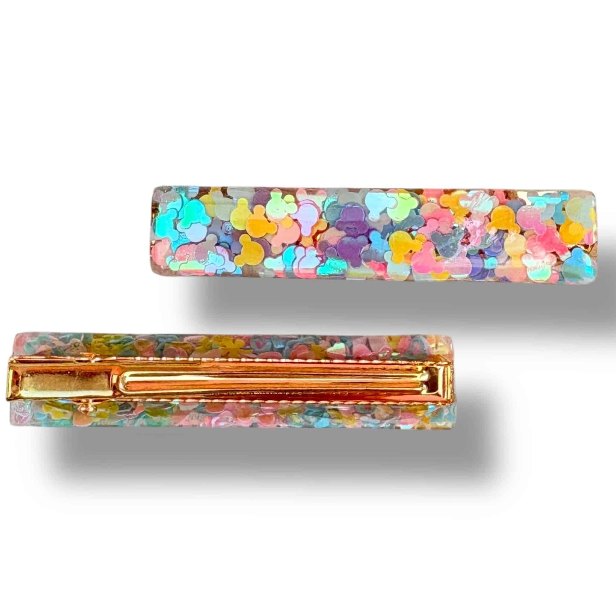 Une jolie barrette colorée et unique avec un traitement UV incrustée de jolies paillettes colorées à formes.