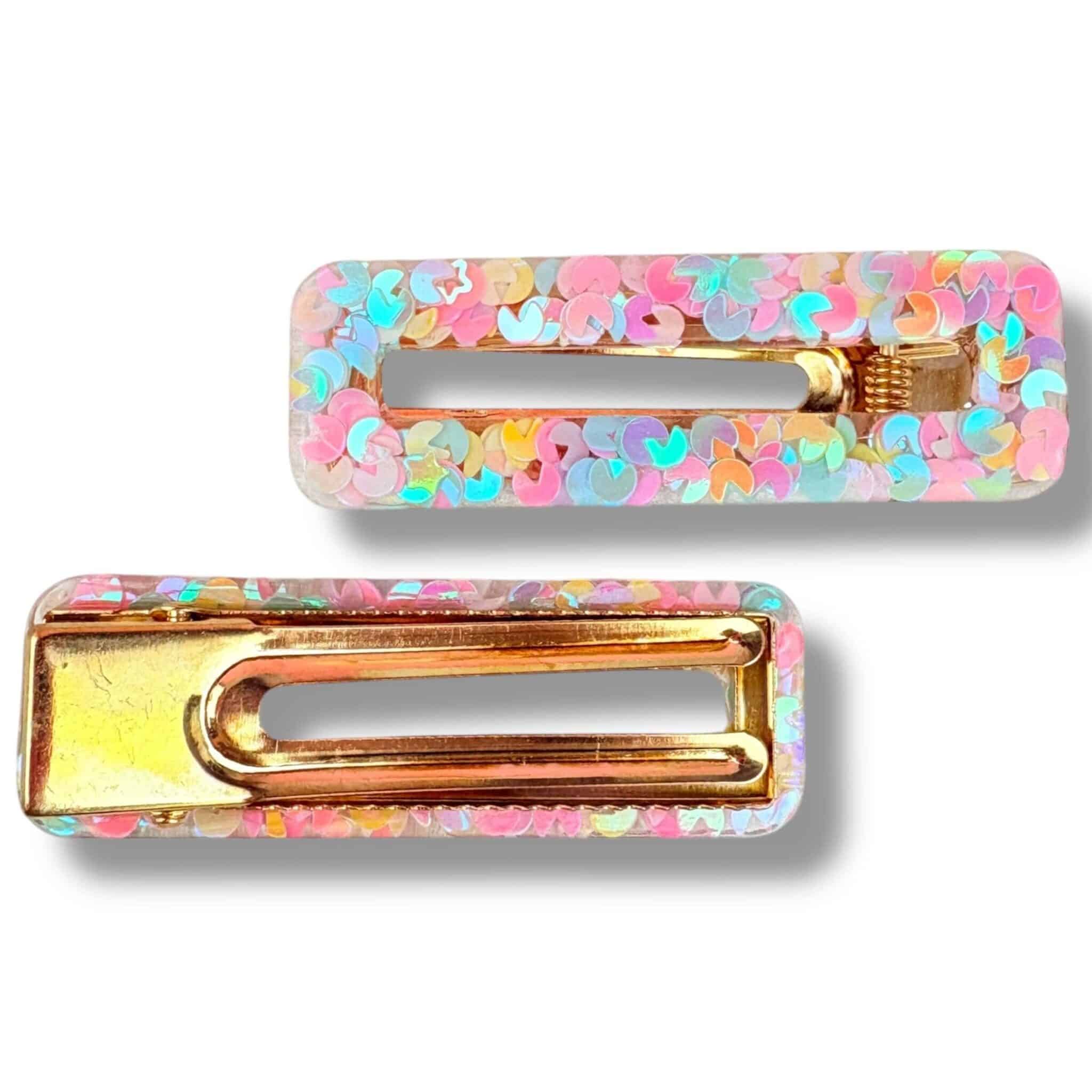 Une jolie barrette colorée et unique avec un traitement UV incrustée de jolies paillettes colorées à formes.
