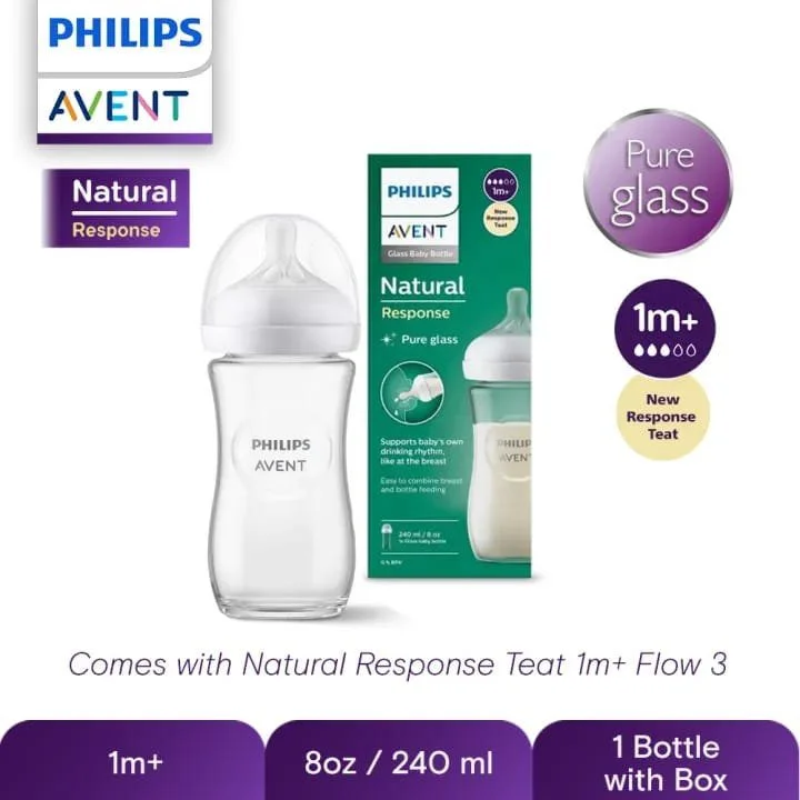 Biberon en verre Natural Response 240ml – Avent, permet à votre bébé de téter, de déglutir et de respirer naturellement, comme au sein. Facilite l’alternance sein/ biberon