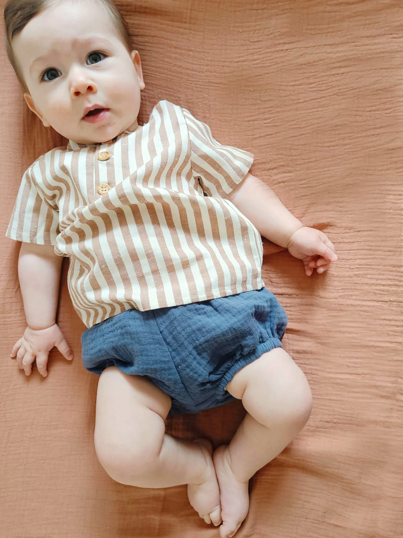 Nous utilisons de la mousseline de coton, également appelée double gaze de coton pour la confection des bloomers. Cette matière est adorée des petits pour sa douceur inégalée.
