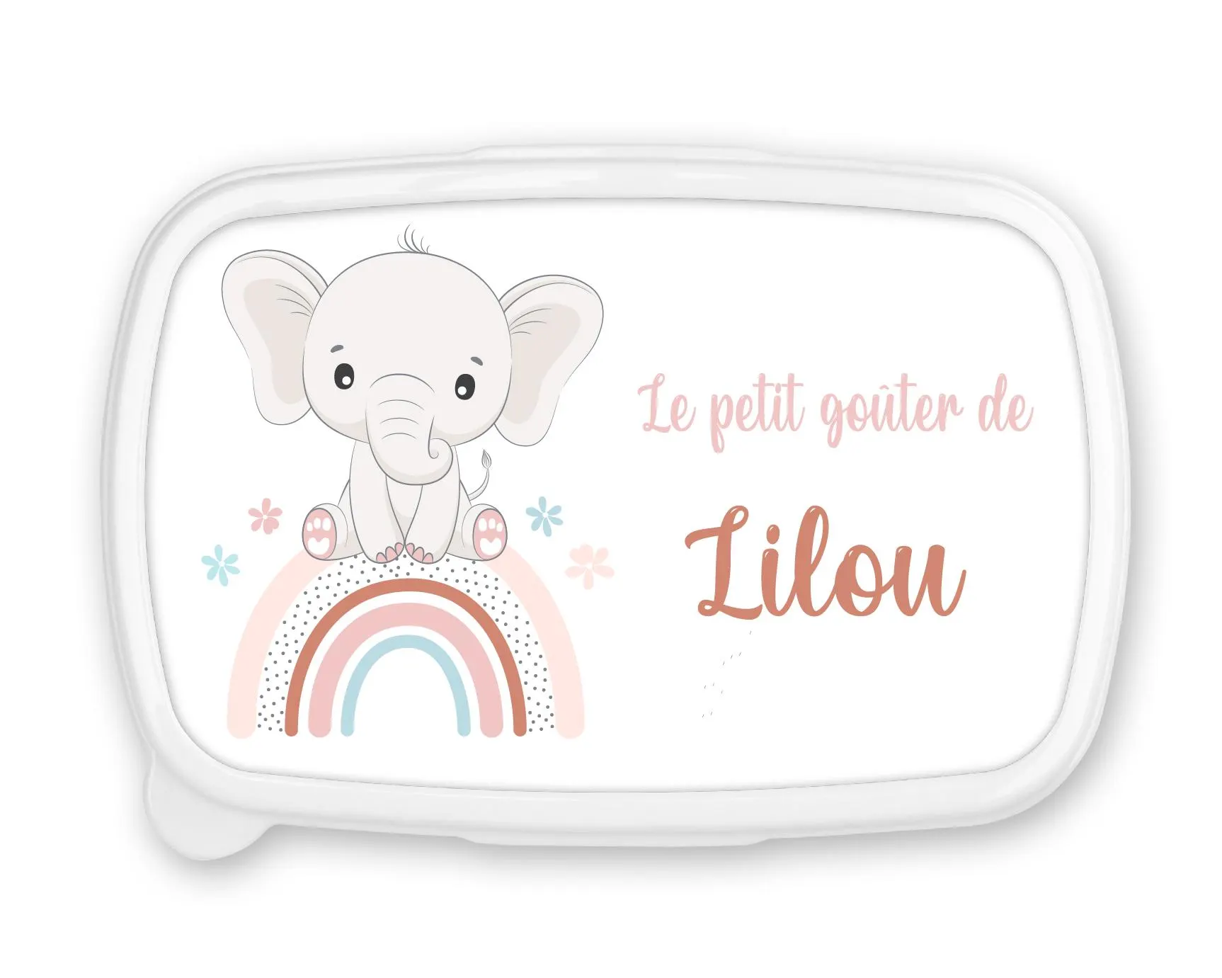 Une boîte à goûter tout en douceur pour une rentrée pleine de tendresse ! Ce modèle personnalisé avec le prénom de votre enfant est illustré d’un adorable éléphant assis sur un arc-en-ciel pastel, accompagné de fleurs sur un fond rose délicat.