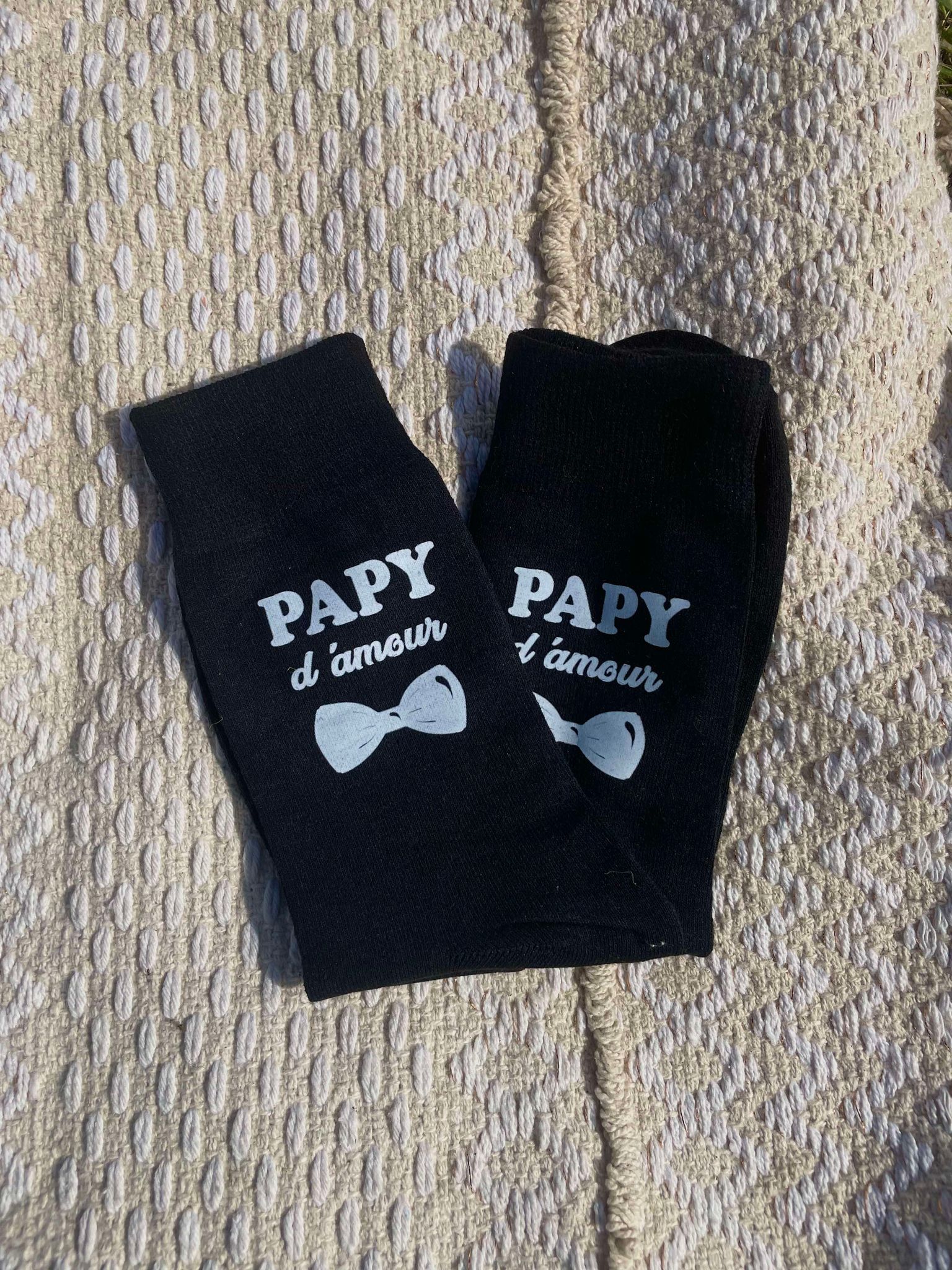 Une boîte contenant plusieurs paires de chaussettes noires avec des motifs humoristiques et affectueux destinés à un grand-père (en français « papy »). Chaque paire a une inscription ou un dessin :
