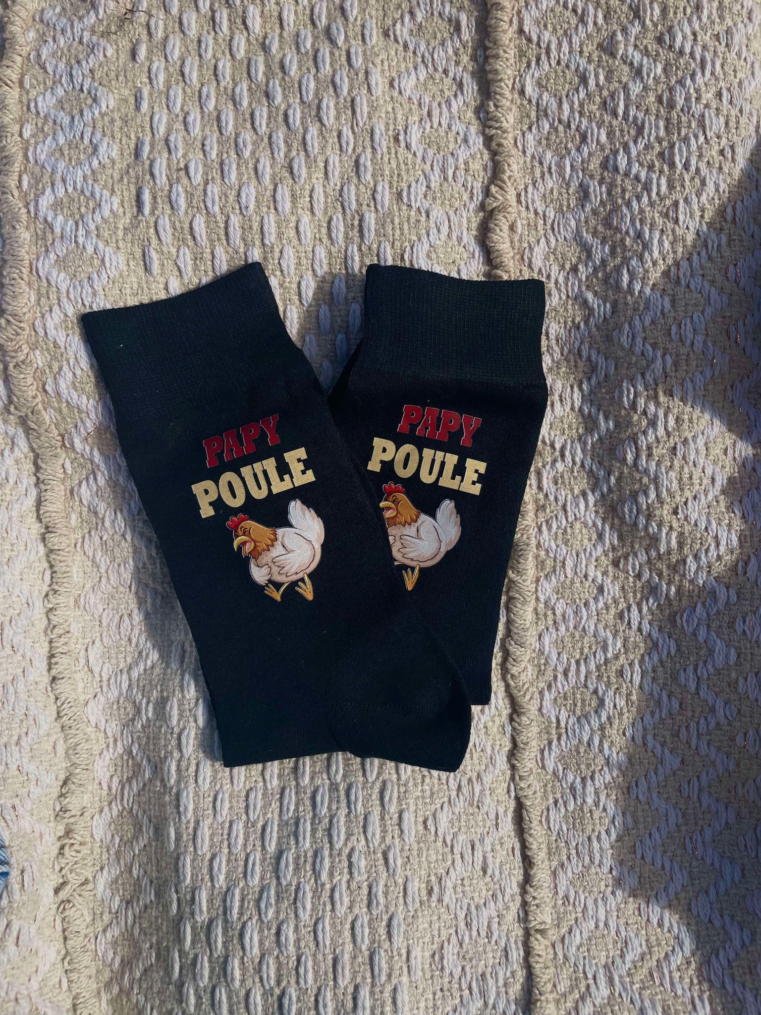 « Papy Poule » avec un dessin d’une poule, évoquant un grand-père attentionné.
