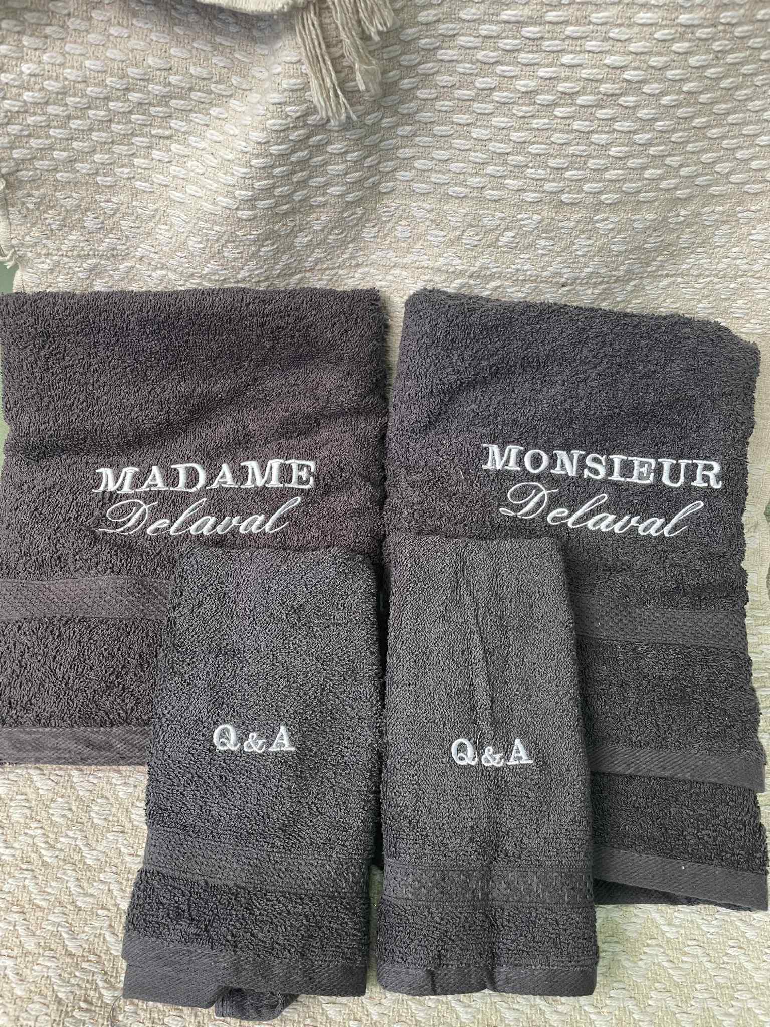 Personnalisation complète : Serviettes brodées avec Monsieur + nom de famille et Madame + nom de famille, et serviette invités avec les initiales des prénoms.