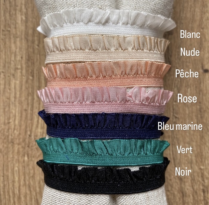 | Bracelet élastique | Elastique plat bleu marine, Elastique vieux rose, Froufrou blanc, Froufrou bleu marine, Froufrou noir, Froufrou nude, Froufrou pêche, Froufrou rose, Froufrou vert |