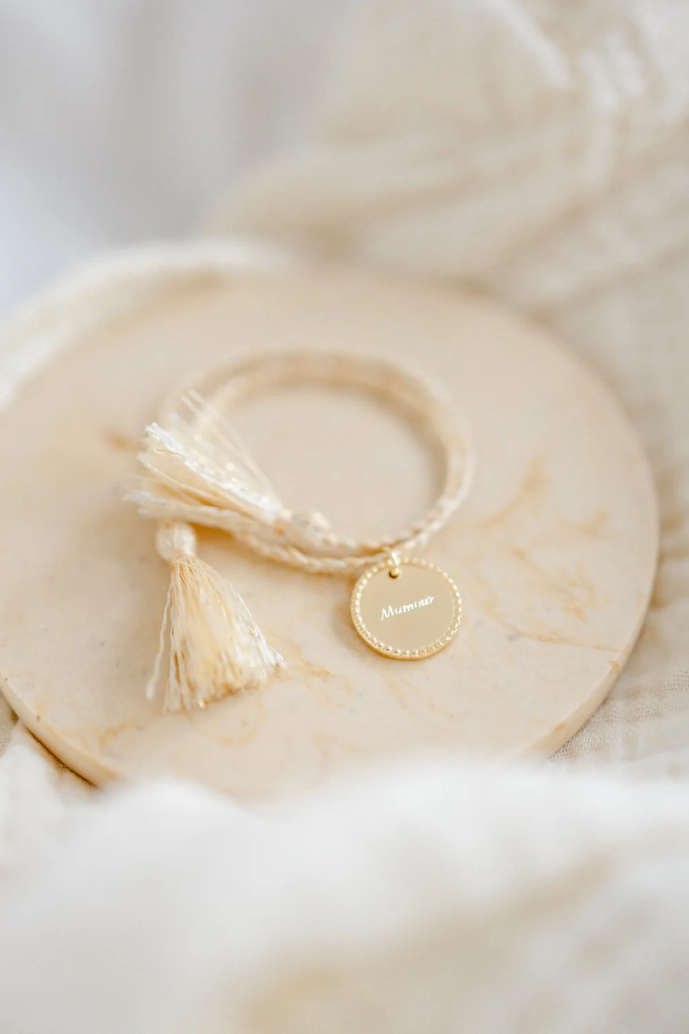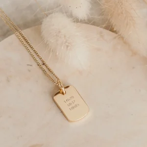 Notre bracelet médaille recouvert d’or 18 carats se personnalise avec vos précieux mots doux avant d’être délicatement noué à poignet.