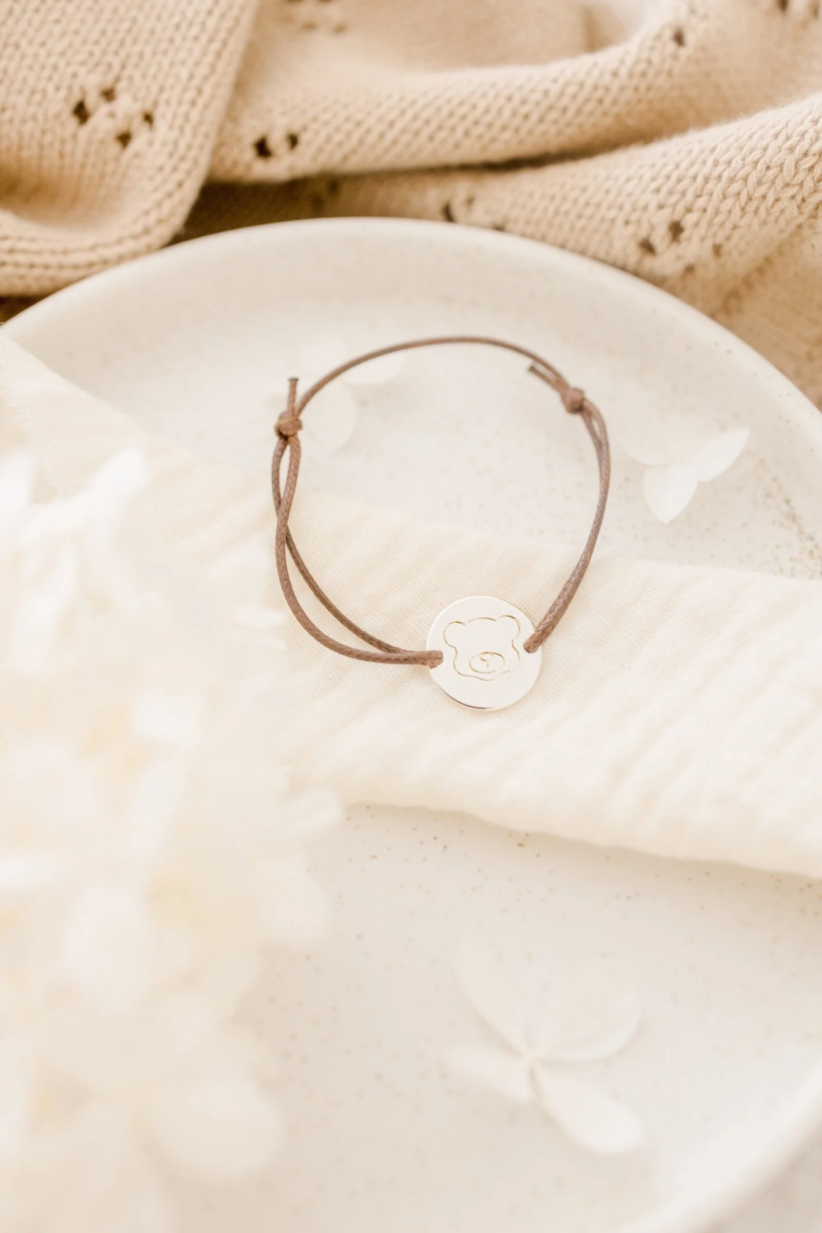 Notre bracelet médaille se personnalise avec vos précieux mots doux avant d’être joliment noué au poignet de votre enfant.