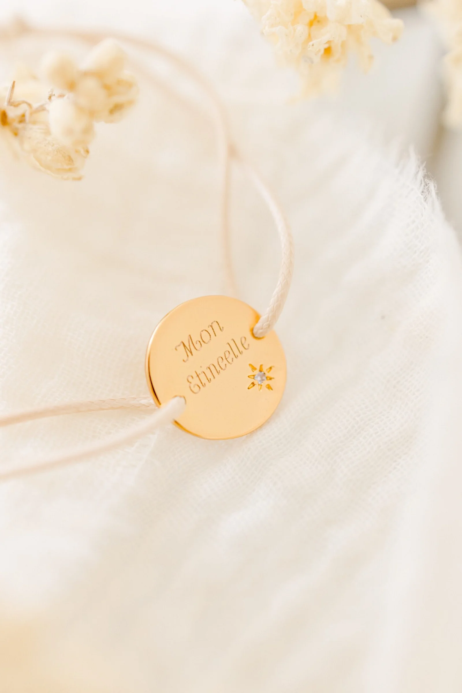 Notre bracelet médaille Mon étincelle délicatement serti d’un oxyde de zirconium se personnalise avec vos précieux mots doux avant d’être joliment noué au poignet.