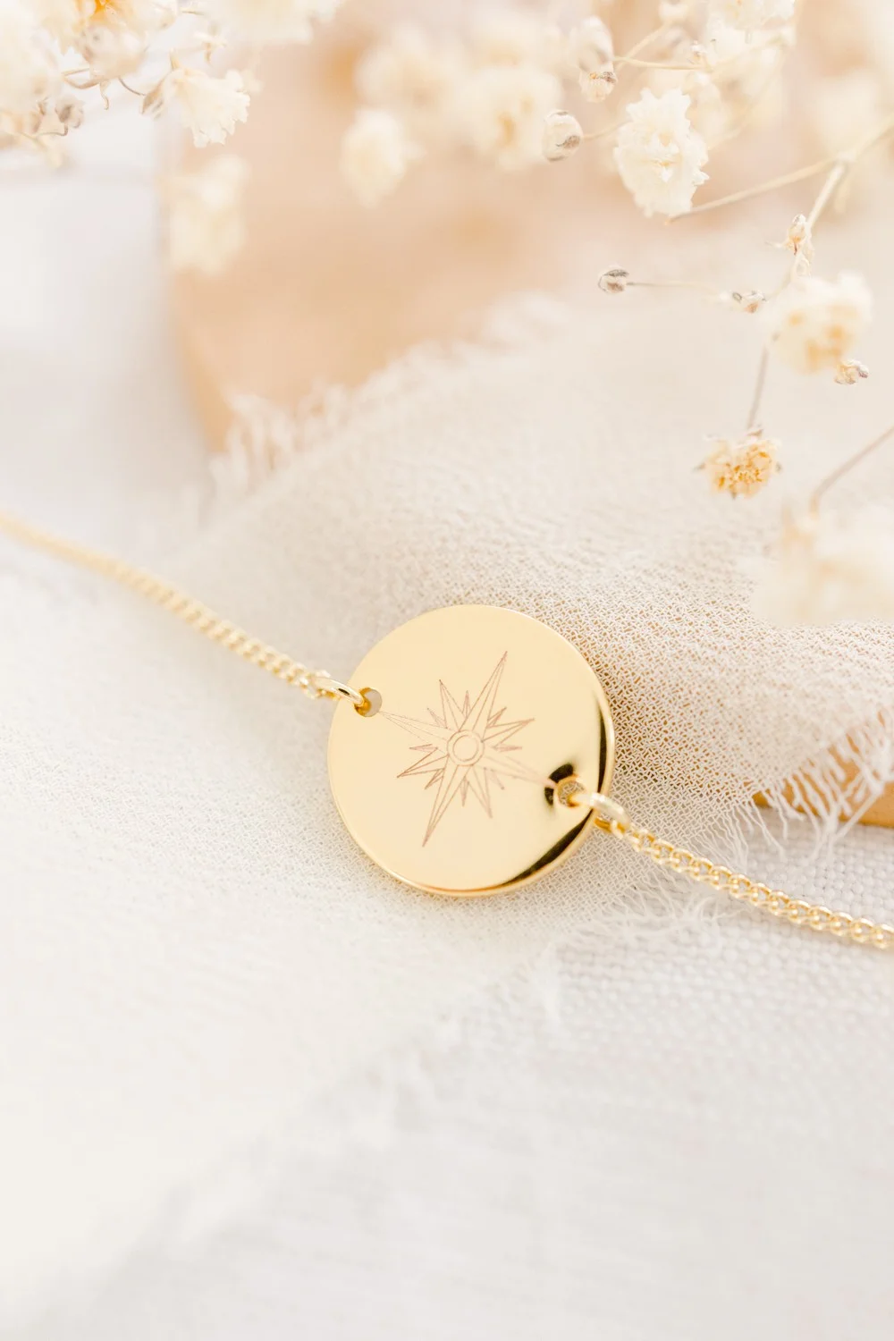 Notre bracelet médaille recouverte d’or 18 carats arbore une merveilleuse rose des vents. Ce bijou pour femme se personnalise avec vos précieux mots doux.