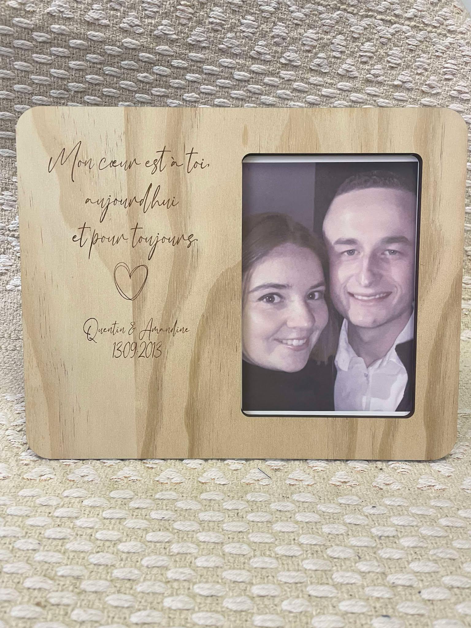 Offrez un cadeau unique et plein de tendresse avec ce cadre photo personnalisé en bois. Gravé avec le message romantique « Mon cœur est à toi, aujourd’hui et pour toujours », il est conçu pour célébrer votre amour ou celui d’un couple proche.