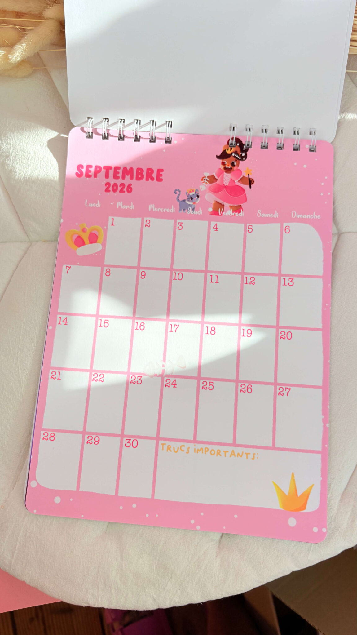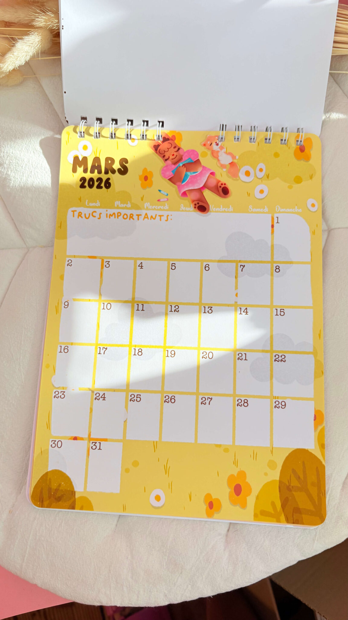 Le format A5 du calendrier 2026 est idéal si tu veux garder ton agenda visuel à portée de main, même dans les petits espaces. Compact et pratique, il conserve toutes les illustrations douces et colorées de la version A4, mais dans un format plus discret.