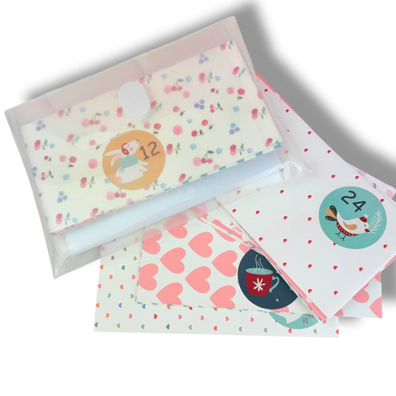 Les 24 enveloppes sont soigneusement rangées dans une pochette plastique réutilisable, idéale pour conserver et protéger vos stickers.