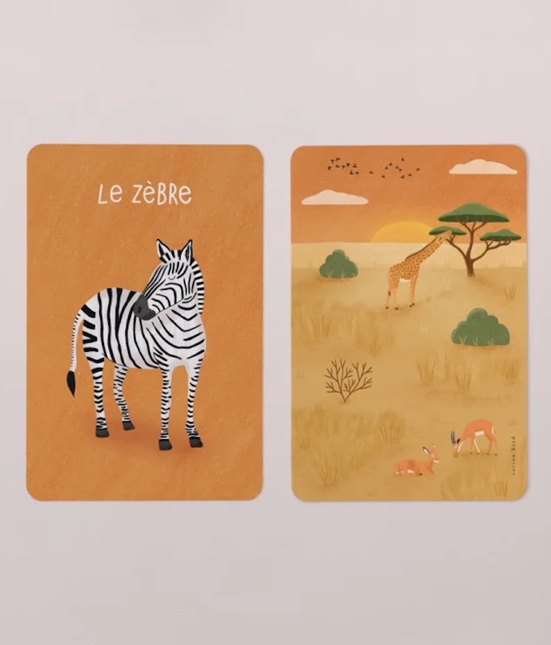 Explorez la savane avec vos enfants grâce à les cartes d’apprentissage Cotton Bird Animaux de la savane !