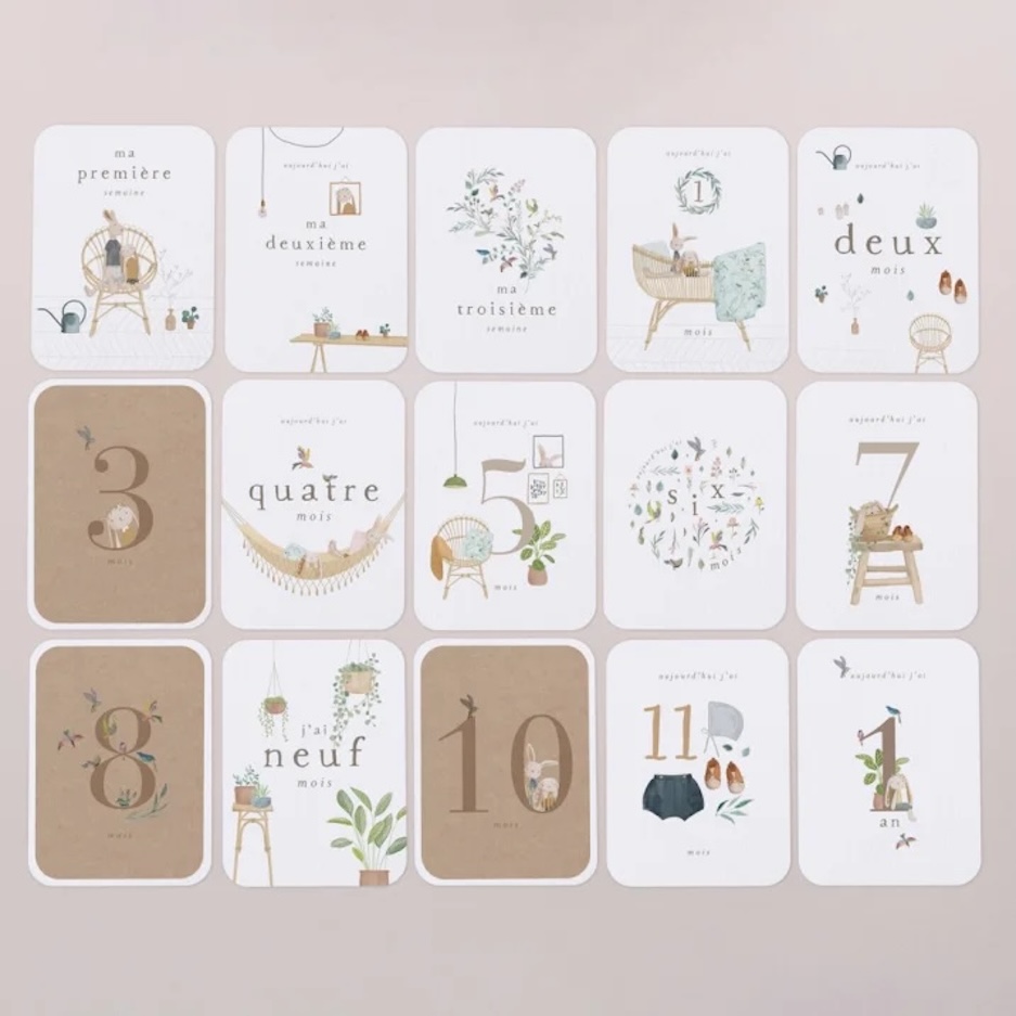 De jolies cartes illustrées pour capturer chaque moment clé, du premier jour jusqu’à ses 12 mois.