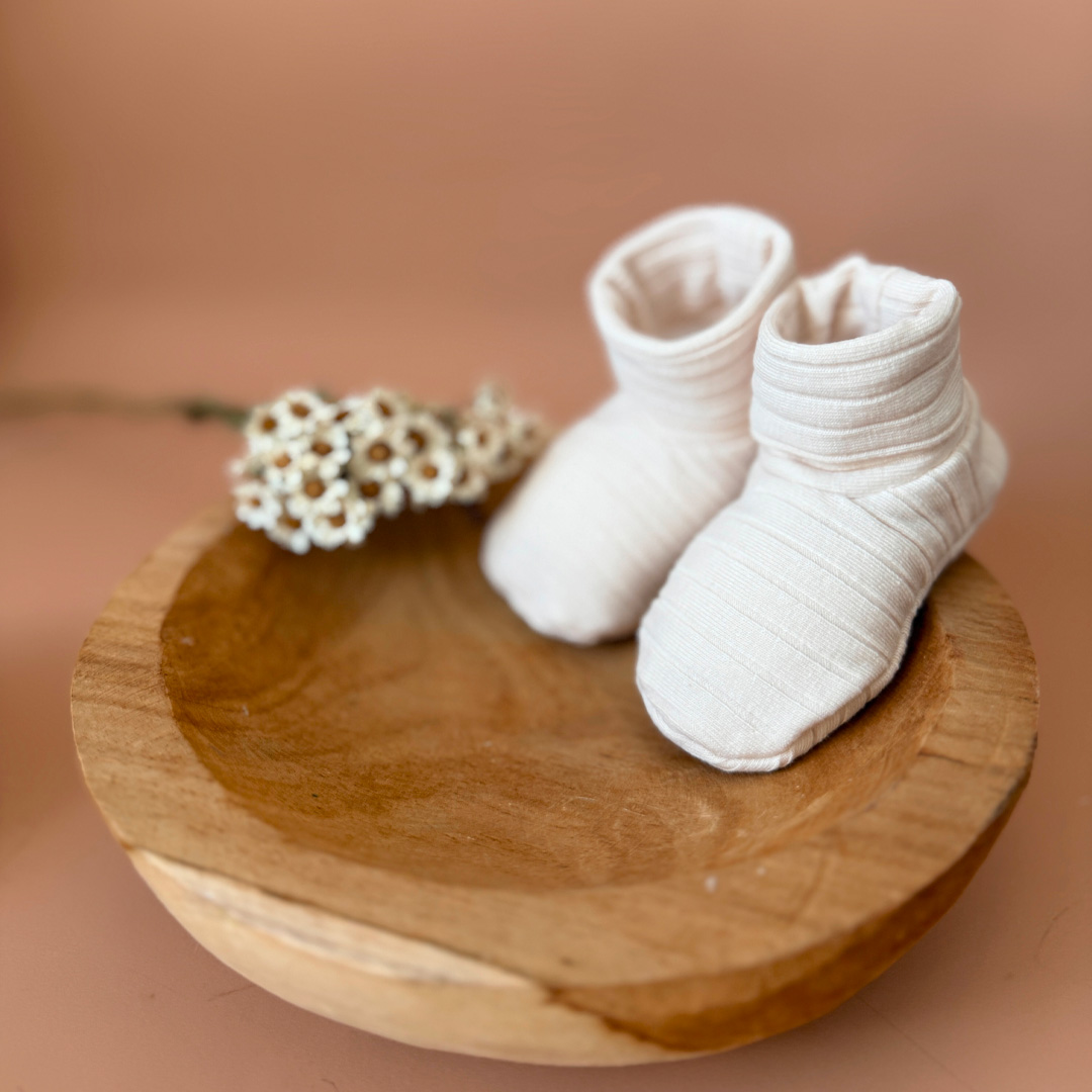Chaussons de Naissance en en Maille d’été Côtelé Beige