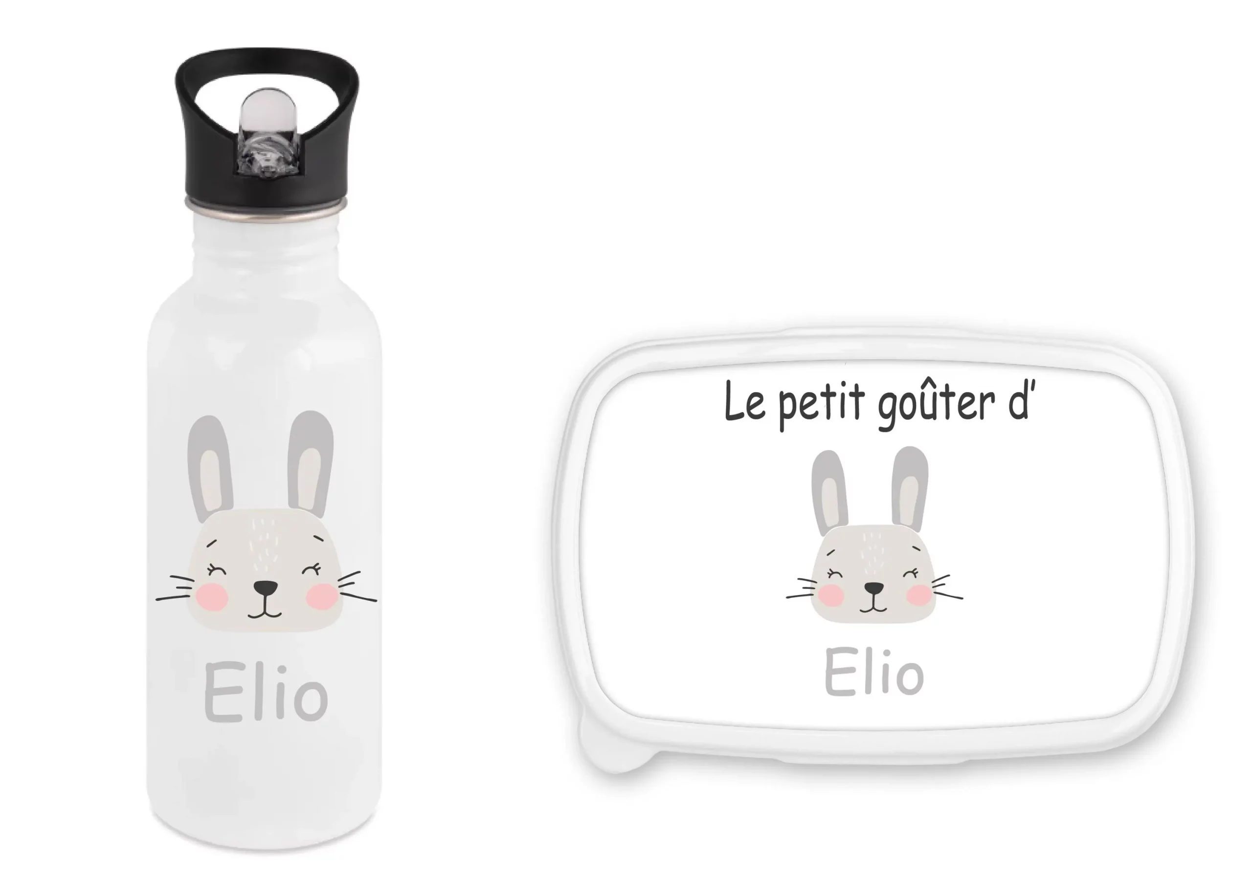 Le tout personnalisé avec un petit lapin gris adorable et le prénom de votre enfant.