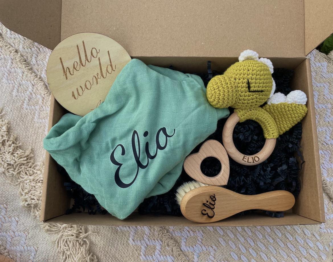 🧸✨ Un joli coffret cadeau pour bébé composé de plusieurs éléments personnalisés.
