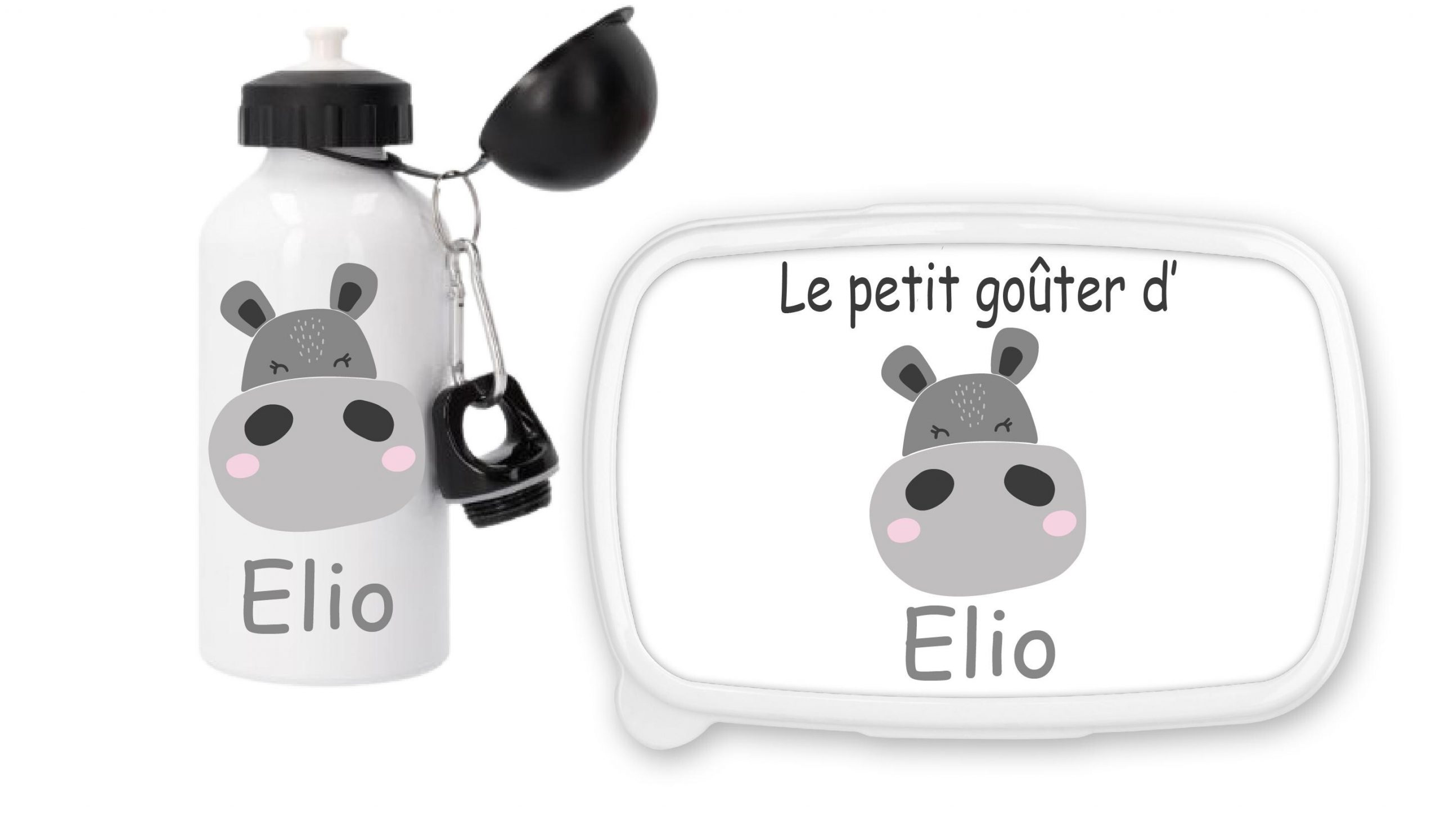 Chaque élément est personnalisé avec un hippopotame rigolo et le prénom de l’enfant. Idéal pour l’école, la crèche, la nounou ou les sorties en famille.