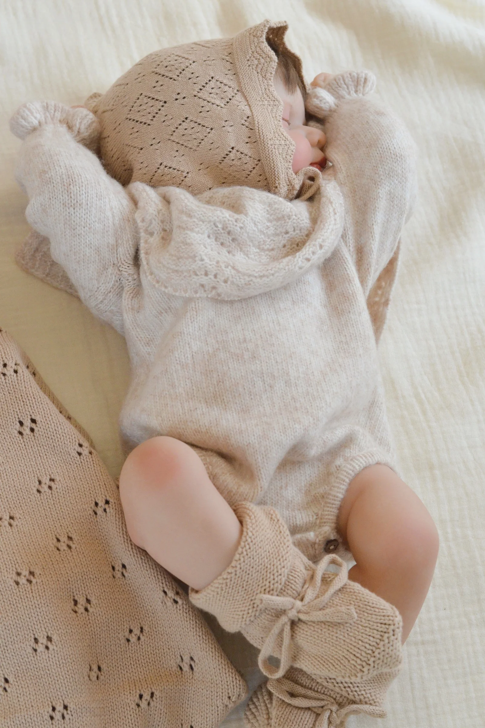 Tout en délicatesse, ce merveilleux coffret de naissance se compose de petits chaussons, d’un adorable béguin et d’une grande couverture tricotés. Ils accompagneront votre bébé dès sa naissance et dans ses premiers mois. Confectionnés en coton, adaptés à la peau délicate de bébé. Ils réchauffent et protègent votre nouveau-né. Un coffret élégant contenant les essentiels du trousseau de naissance.