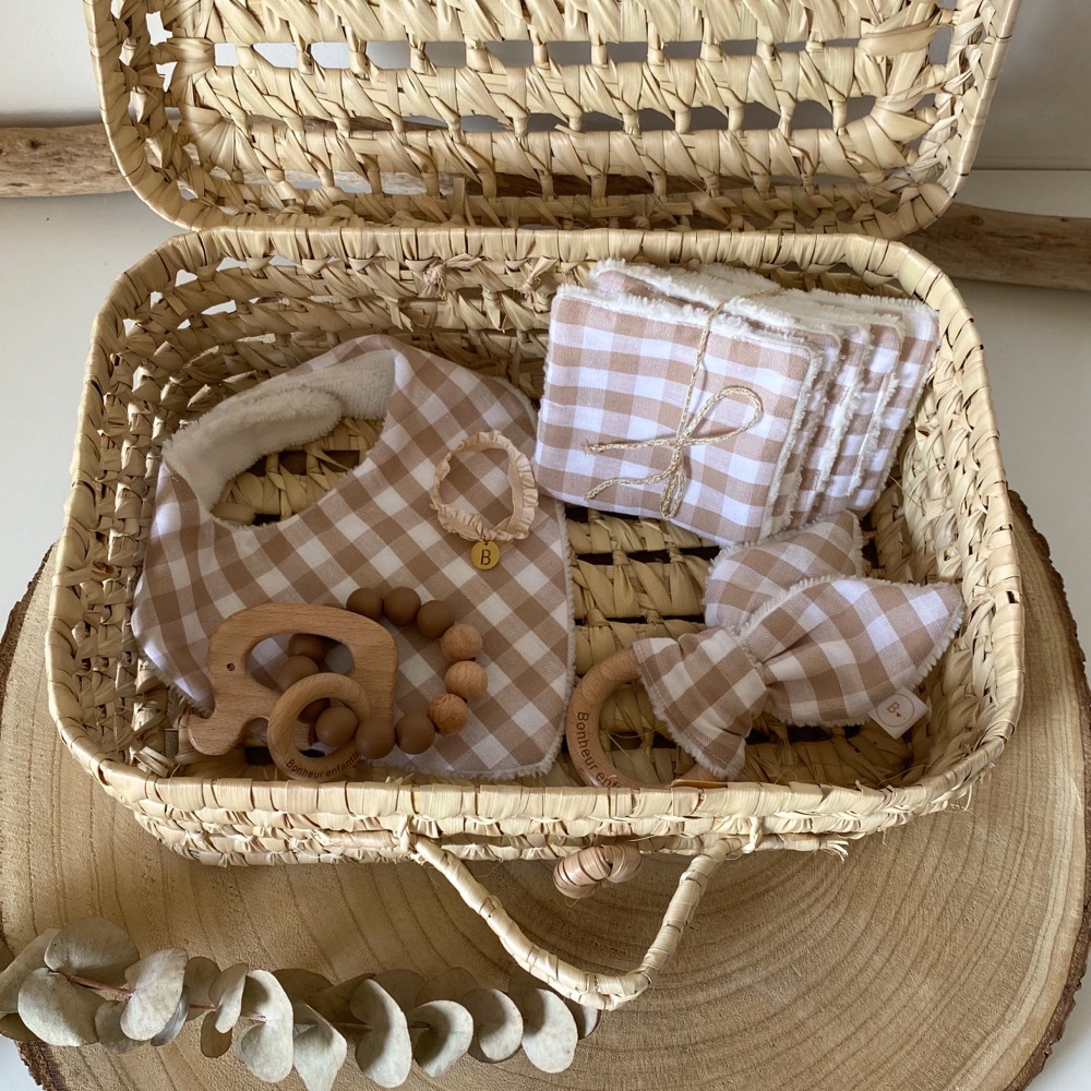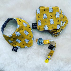 Le bavoir et le hochet sont composés d’une face en éponge oekotex écru ou grége et d’une face en tissu coton bio ou double gaze oekotex au choix. La taille du bavoir est de 6-12 mois et la couleur de la pression sera ajustée selon le tissu choisi.