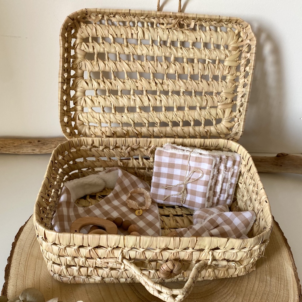 Et pour finir la petite valisette en feuille de palmier, à utiliser en décoration, comme boîte aux trésors ou pour ranger les petits jouets de bébé. Celle-ci apportera une touche de naturel à la chambre. Sa hauteur est de 13 cm, sa longueur de 28 cm et sa largeur de 21 cm. Chaque malle est unique, la dimension peut légèrement varier.