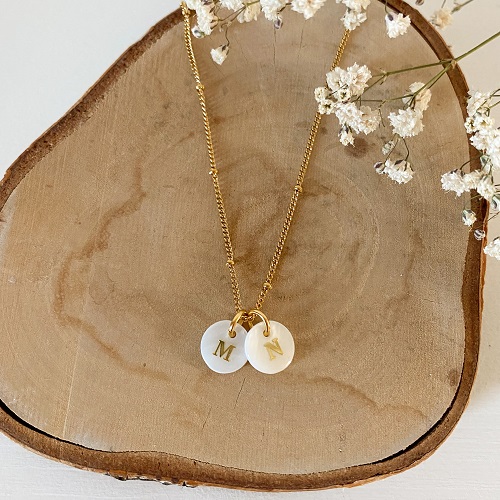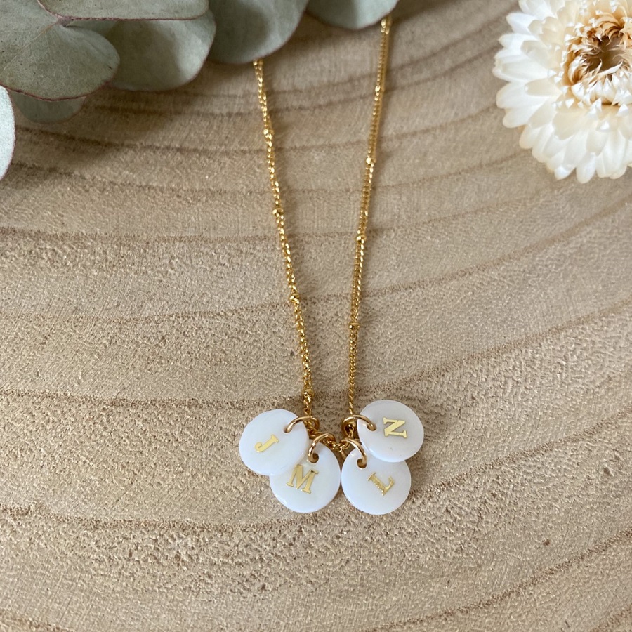 Il est conseillé de retirer le collier au contact de l’eau, afin d’éviter que la lettre ne se détache de la nacre. Si le cas se présente, n’hésitez pas à me contacter.