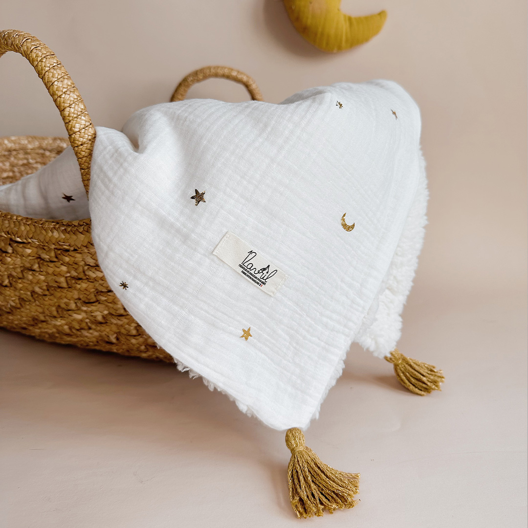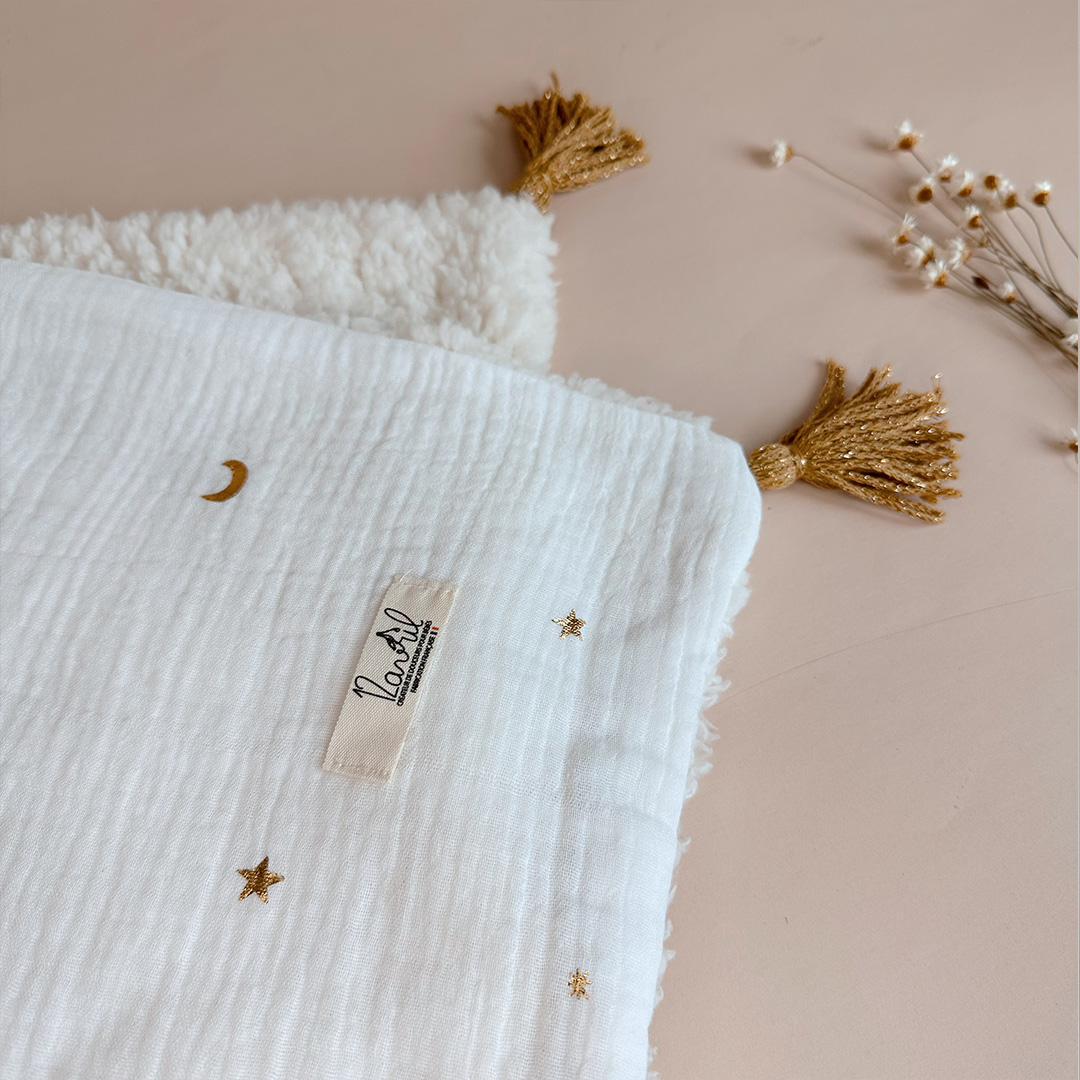 La couverture est une des pièces indispensables du trousseau de bébé. Vous serez surpris par son coté extrêmement doux en fausse fourrure esprit « mouton » écrue , et son côté en gaze de coton fond naturel, avec un doux motif de lunes et étoiles floqués qui transportera bébé dans ses rêves lors de ses siestes . Les angles sont agrémentés de jolis pompons couleur doré.