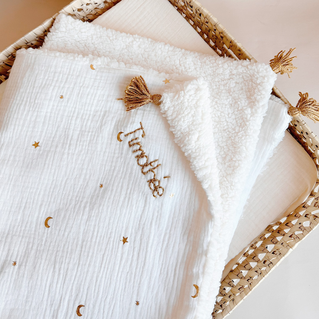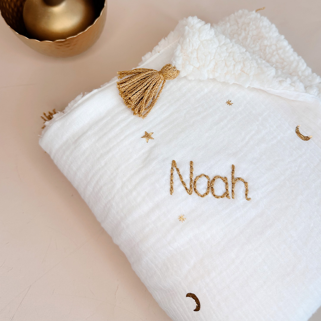 Possibilité de broder le prénom de bébé de couleur doré. La broderie se fait de biais dans un angle de la couverture.
