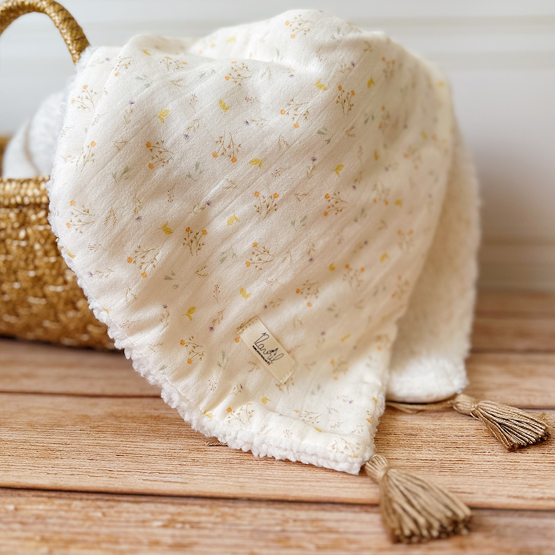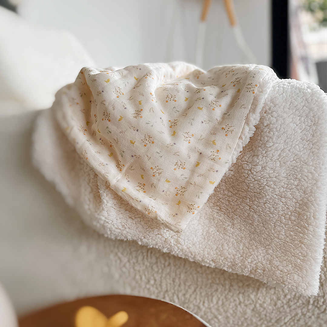 Cette couverture est idéale pour bien réchauffer les bébés grâce à sa fausse fourrure Sherpa couleur écrue, et sa doublure en gaze de coton biologique hypoallergénique au magnifique motif petites fleurs des champs. Un motif doux, lumineux et unisexe.