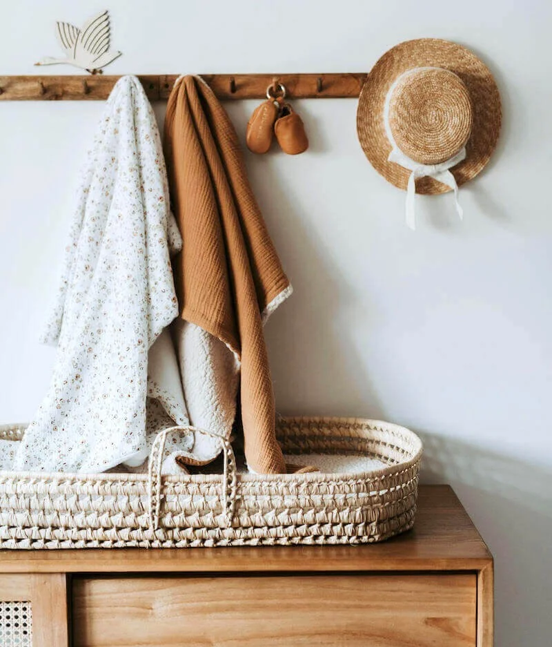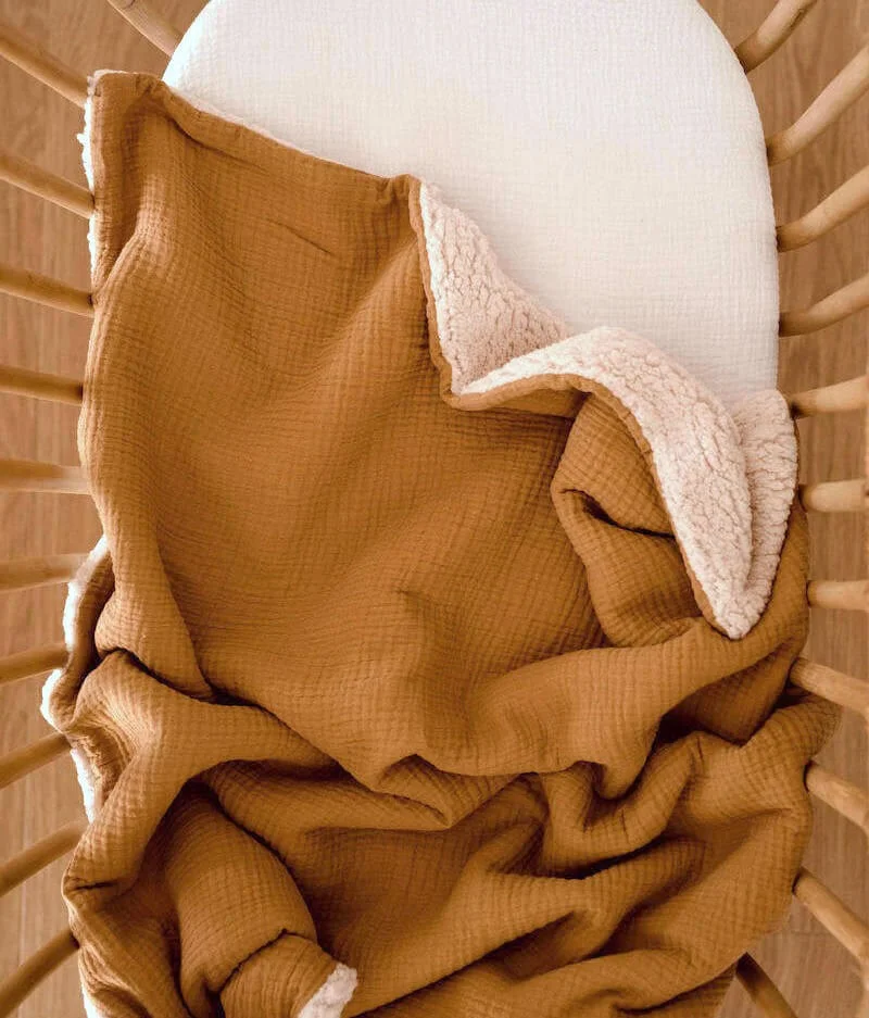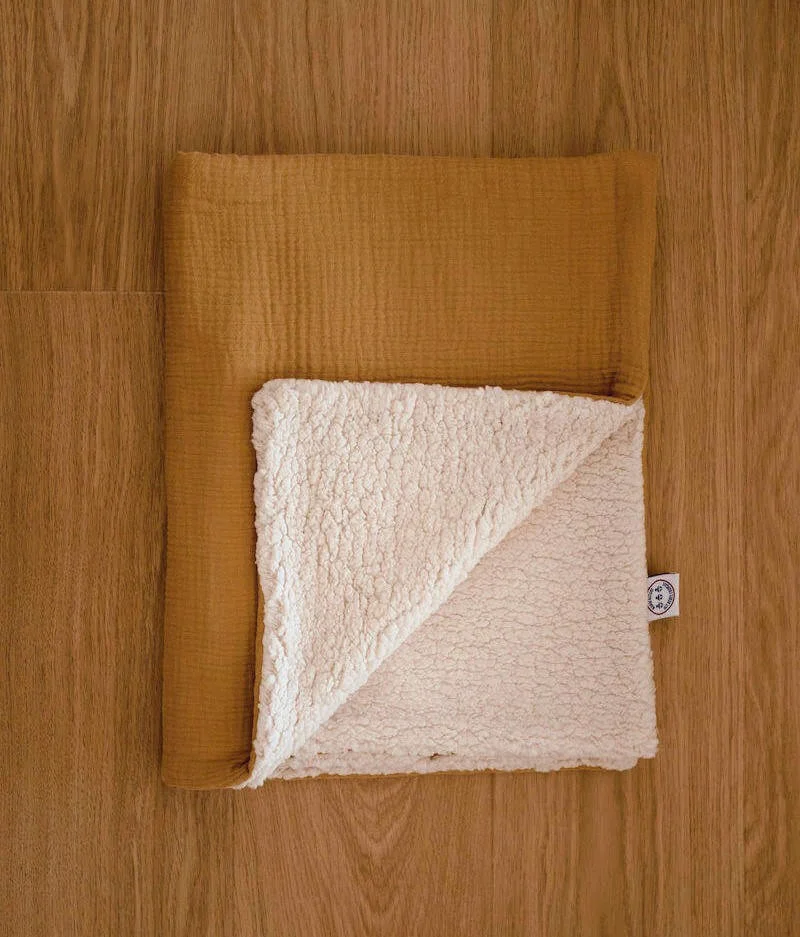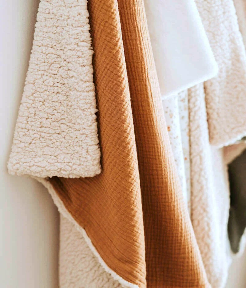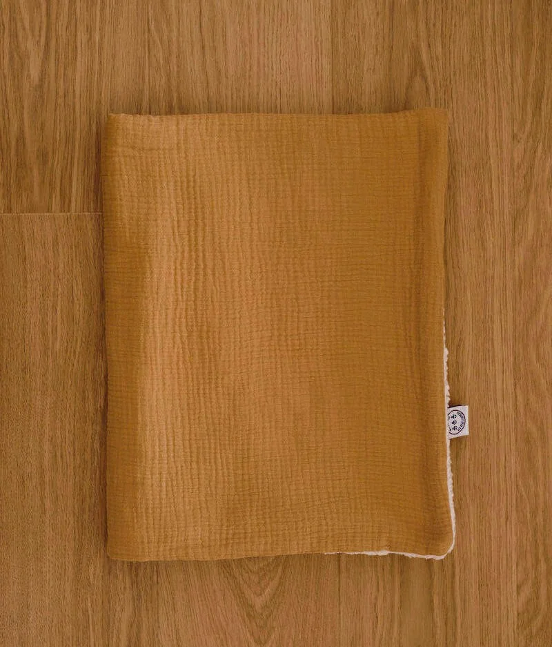 - Moumoute écru ultra douce et double gaze de coton couleur camel certifiés sans substance nocive ou irritante.
