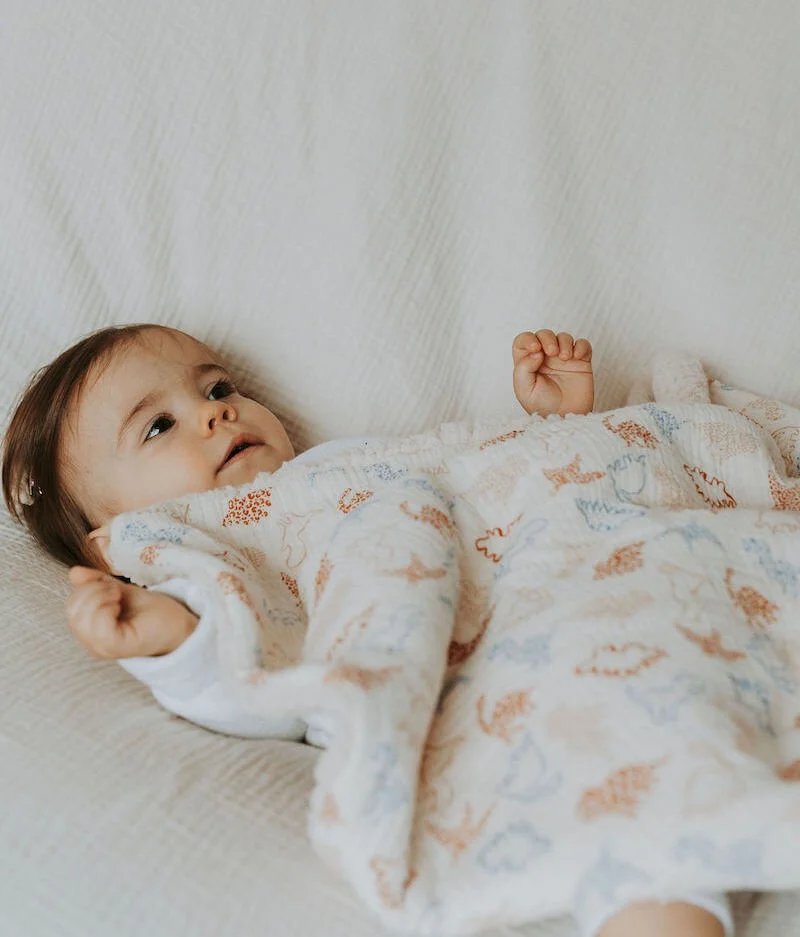 - Moumoute écru ultra douce et double gaze de coton écru à motifs dinosaures certifiés sans substance nocive ou irritante.
