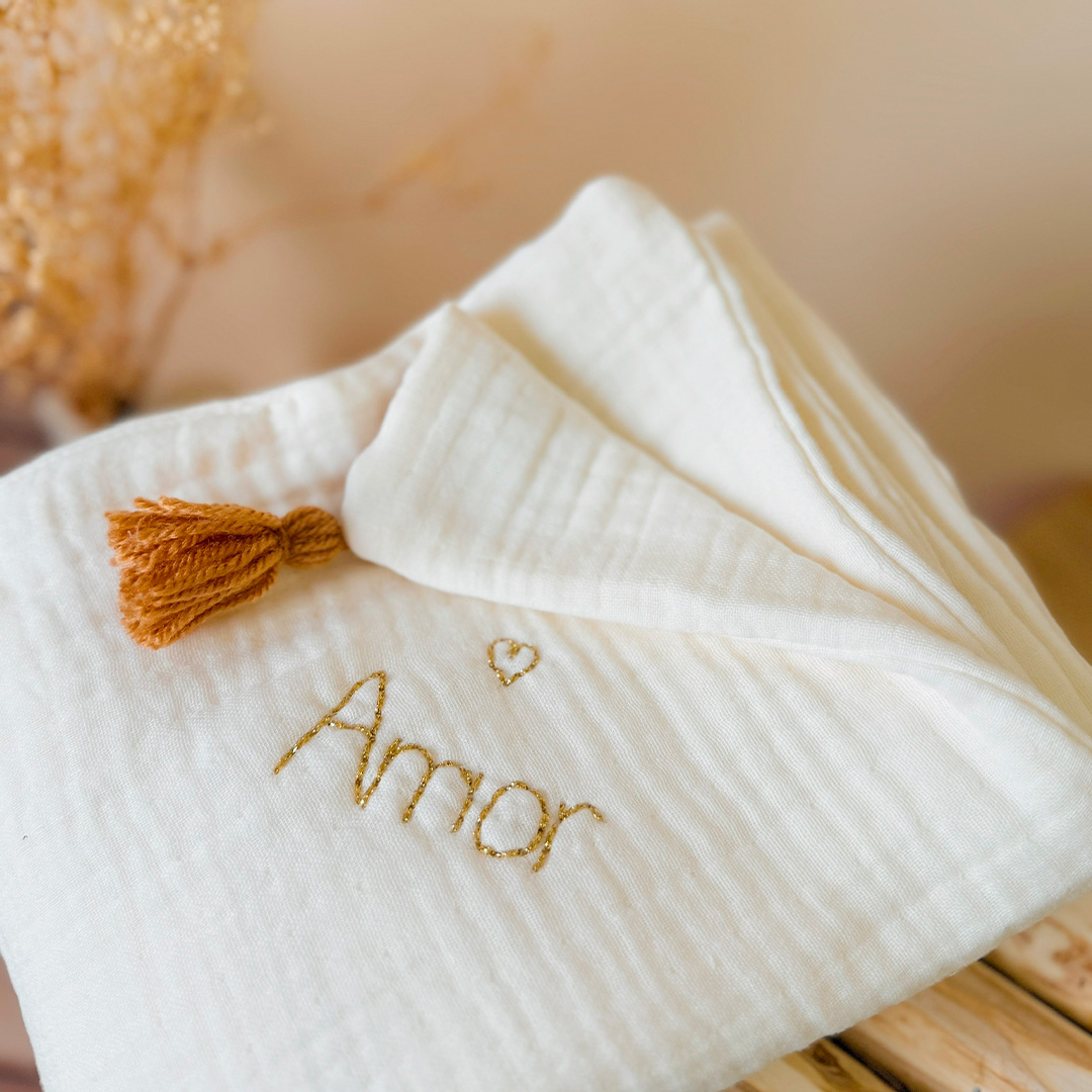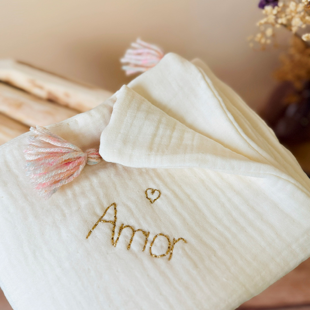 Vous avez la possibilité de personnaliser cette couverture avec le prénom ou le surnom de bébé, brodé à la main dans le même coloris que la couleur des pompons. La broderie est effectuée dans un angle de la couverture, en biais.
