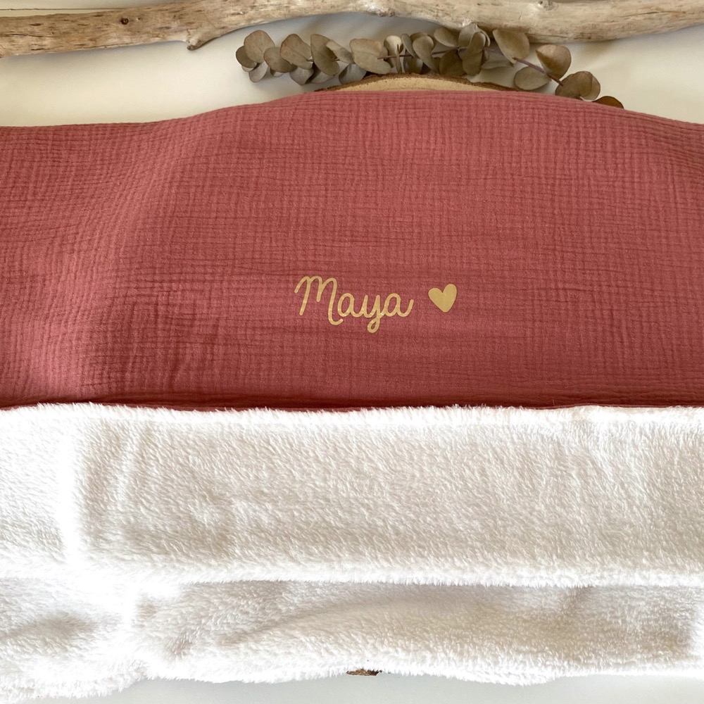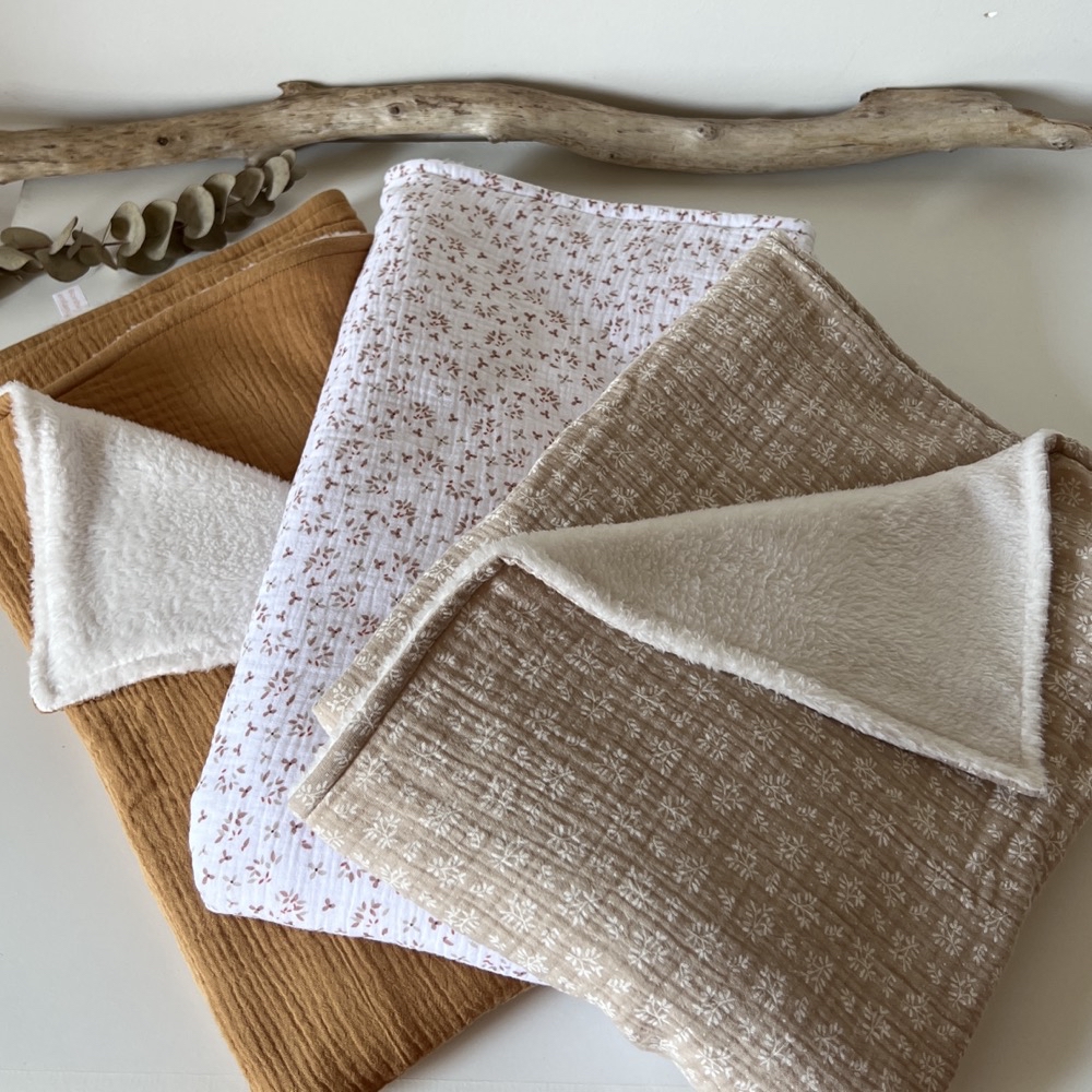 Une face en coton oekotex ou en double gaze de coton oekotex au choix. Et l’autre coté en polaire tout doux épais.